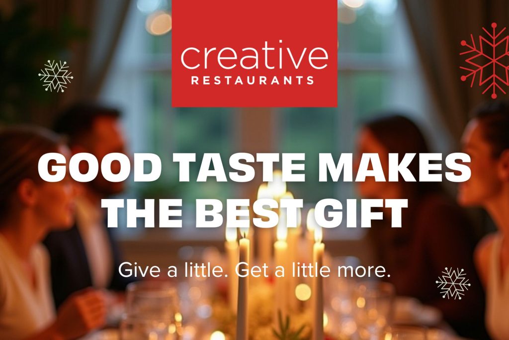When you purchase a $100 gift card from any Creative Restaurant — in-house or online — you’ll receive a $25 bonus card to enjoy in the new year.